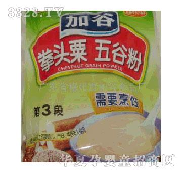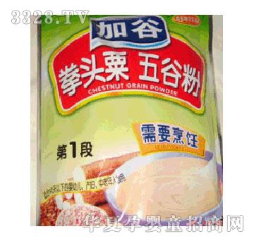 加谷拳头栗五谷粉即冲即食第2段 五谷粉是五谷杂粮(谷类。豆类。坚果类。根茎类)食品精制,是根据中医五谷养五脏。粗细搭配。均衡营养的原理,采用大米。(拳头栗)栗米。燕麦。黄米。淮山。莲子。芡实,雷茶加工而成。 五谷养五脏-水谷精微的细化。生血气。营养五脏六腑。四肢百脉。 母乳是宝。五谷是纲。五谷杂粮人体所需是所有人群理想的营养饮食品。第2段90天以上婴幼儿食用,孕妇中老年人均可食用,即冲即食有糖型。