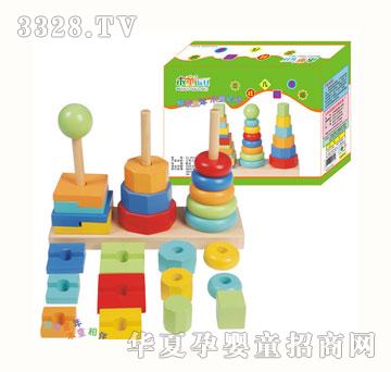 三柱几何套塔 材料:榉木 适应年龄:36个月以上 装箱数量:20PCS 包装方式:彩盒中英文 外箱尺寸:59*50*45CM 包装重量:1.3KG 产品尺寸:28.7*9.6*21.7CM 详细说明:圆形的彩色套塔,几何体形状套塔,不同形状颜色的套塔。这是一款形象生动的动手游戏,训练孩子的手眼协调能力,孩子们在完成游戏的过程中能够认识颜色,大小,高低,几何形状,同事还需考虑物件搭配的合理性和整体的美感。