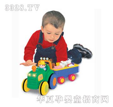 农场动物拖拉车 这是一辆深受小朋友欢迎的电动拖拉机。按下方向盘,拖拉机就会鸣号,按一下可爱的小司机,还会唱出动听的歌曲。按下烟囱,拖拉机就会发出逼真的引擎声并且越走越远。