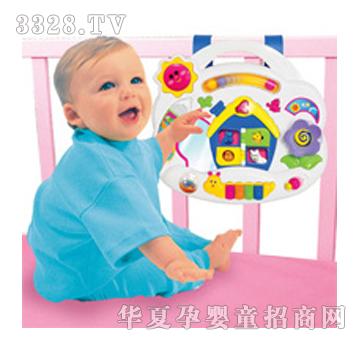 音乐活动挂床板 这块玩具挂床板设有多种活动,可以给小朋友带来不少快乐时光!按下玩具板按钮会出现闪闪灯光,电动机械装置更会让珠子飞来弹去。板上的小孔会出现可爱的卡通人物,按一下这些他们,还会发出赞赏宝宝的声音!彩色的钢琴键可弹奏出动听的曲调;装有彩珠的滚轴,或滑动蜗牛、看看转换的图案,都会为宝宝带来无穷乐趣!玩具板附有手柄和绑带,既方便携带,又容易系于宝宝床板上、以确保安全。
