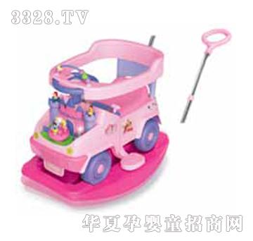 4合1公主学步车 这款玩具车设有摇摆底座、安全围栏及手推手柄。装上摇摆底座,就是一个摇摆座椅。卸掉底座,就可当学步车玩耍,再装上手推手柄,就成了一辆手推车。此玩具适合不同年龄的婴孩使用。车上的小公主们随着音乐翩翩起舞。车身上设有琴键,可以弹奏出美妙的音乐,培养孩子的音乐天分,乐趣无穷。转动打火钥匙可以听到逼真的引擎声和汽笛声。